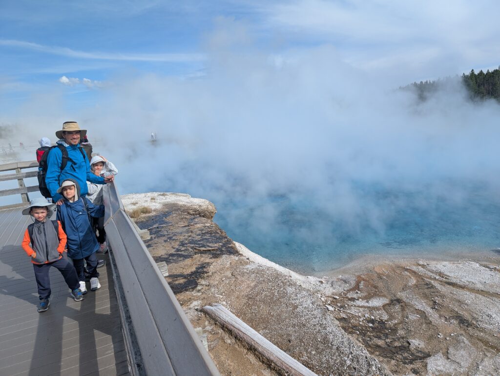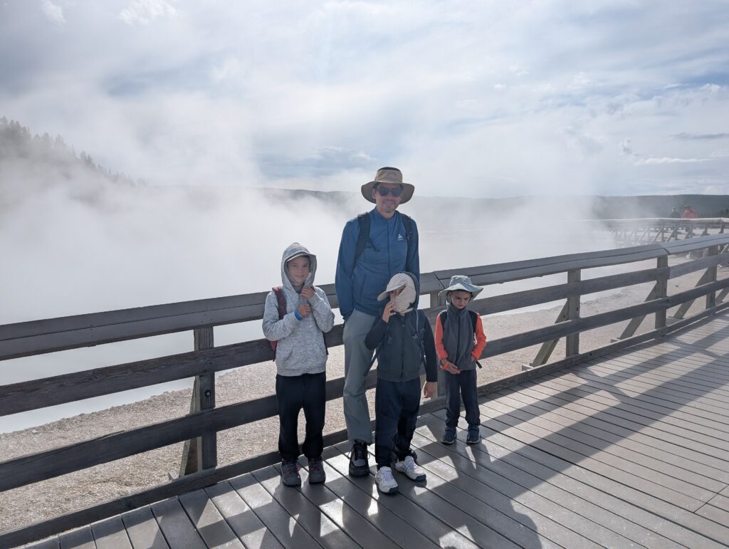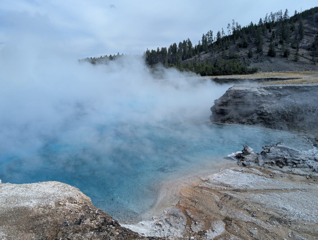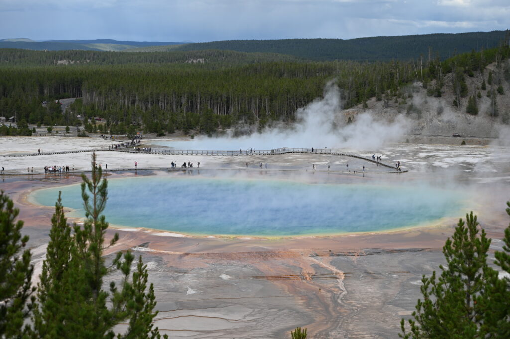 Voici l’exemple du « Grand prismatic spring » : d’abord masqué par la brume (photos du haut). Ensuite, plus tard dans la journée, en revenant d’un autre point de vue, la vapeur s’était dissipée (dernière photo) : le bassin apparaissait beaucoup plus net, et le décor devenait soudain splendide. Deux ambiances totalement différentes au même endroit !