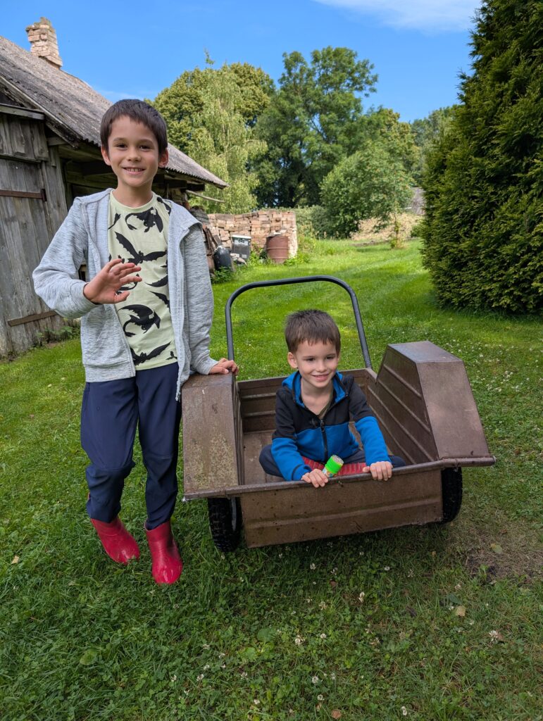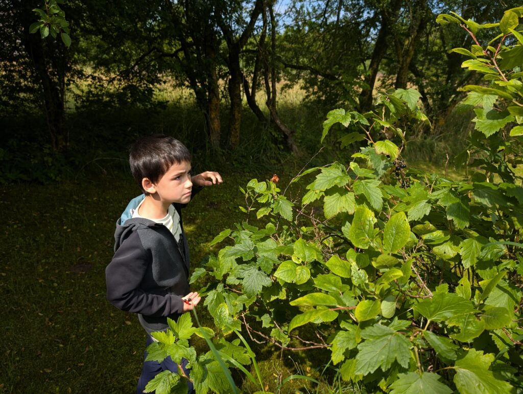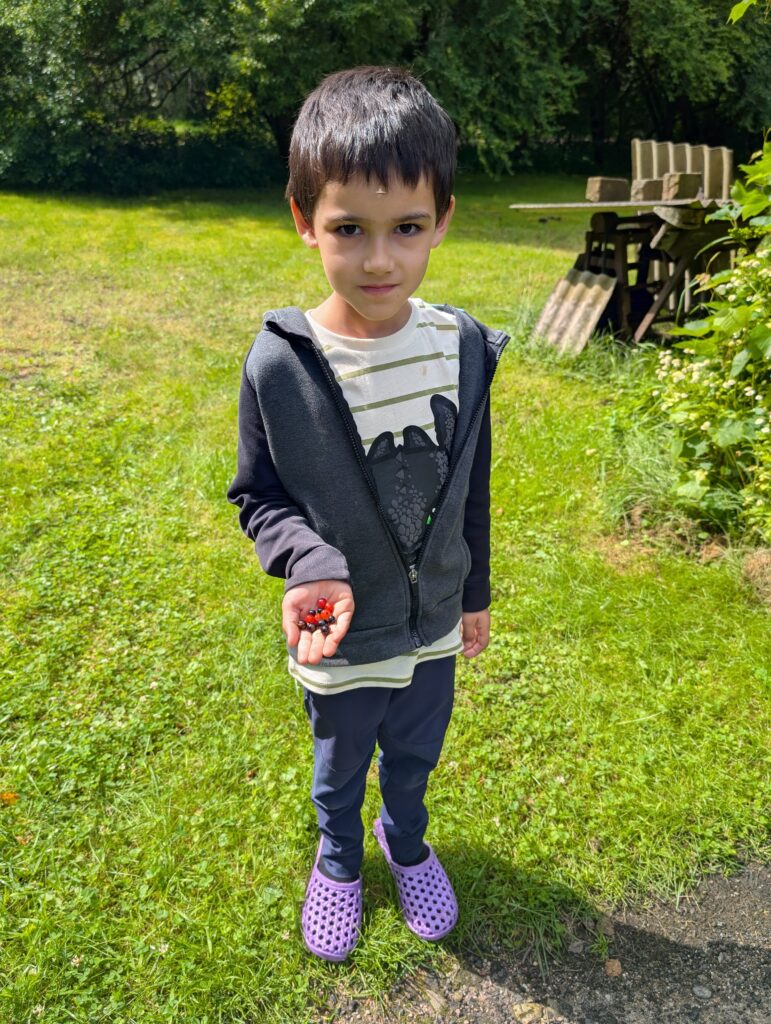 J’ai découvert la maison de mamie et papi. Il y avait plein de fruits délicieux : des framboises, des groseilles, des myrtilles, des pommes. On a fait beaucoup de tours de brouette avec Adrien et tonton. Moi aussi j’ai essayé mais elle était trop lourde avec Adrien et Thomas dedans.