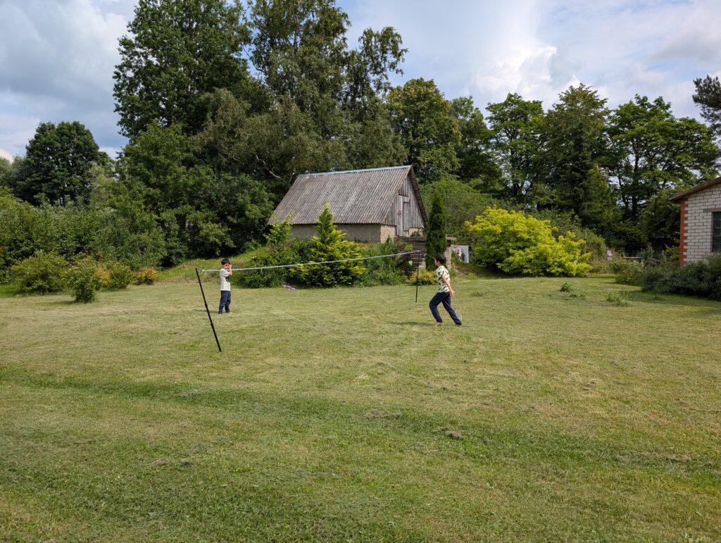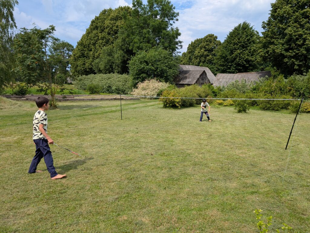 Dans le jardin de papier mamie, il y a un jeu de badminton. Je ne connaissais pas ce jeu et je l’ai découvert chez papi et mamie. On joue beaucoup au badminton et c’est très bien. Adrien joue bien mais moi j’envoie beaucoup trop loin et un peu trop haut.