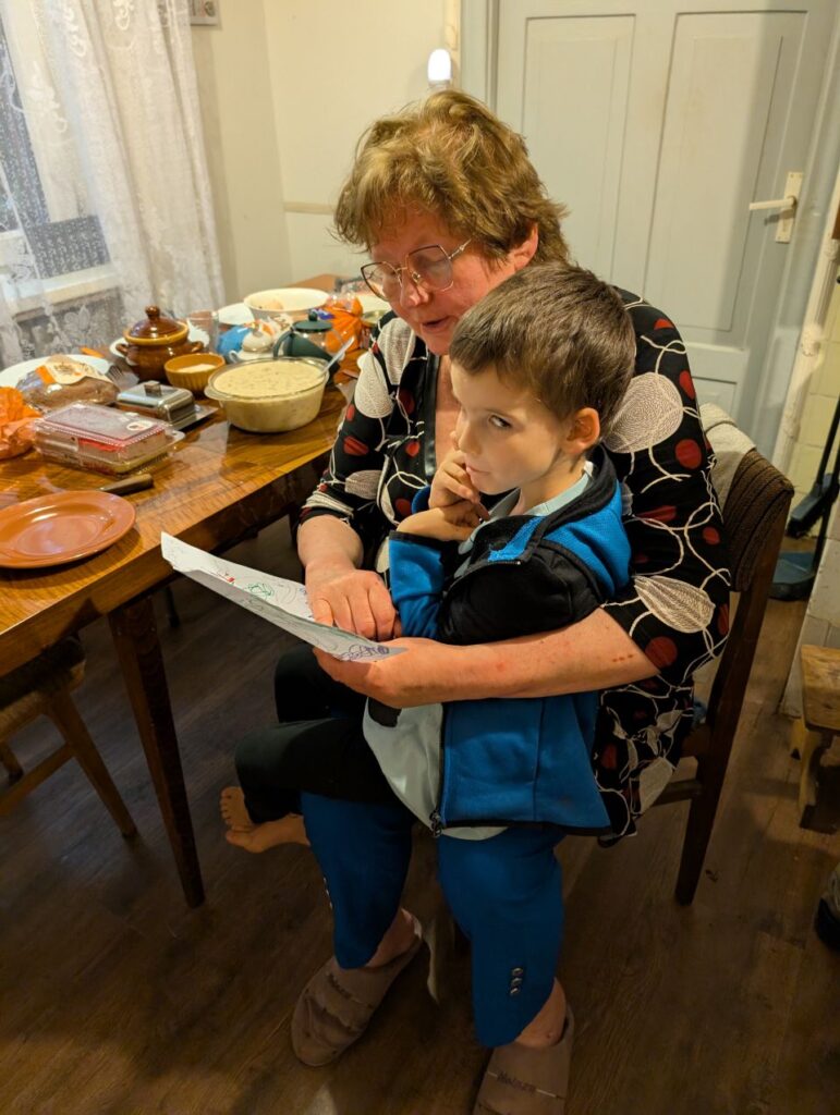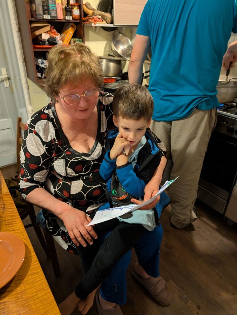 J’ai rencontré ma mamie que je ne connaissais pas. Elle parle Letton et je ne comprends pas beaucoup mais quand même quelques mots comme « ya » qui veut dire oui et « ne » qui veut dire non, « udens » ca veut dire de l’eau. Au premier coup d’œil j’ai senti que Mamie était gentille. Elle nous a donné une petite pochette avec un carnet, un crayon ou un stylo des gommettes et après j’ai oublié.
