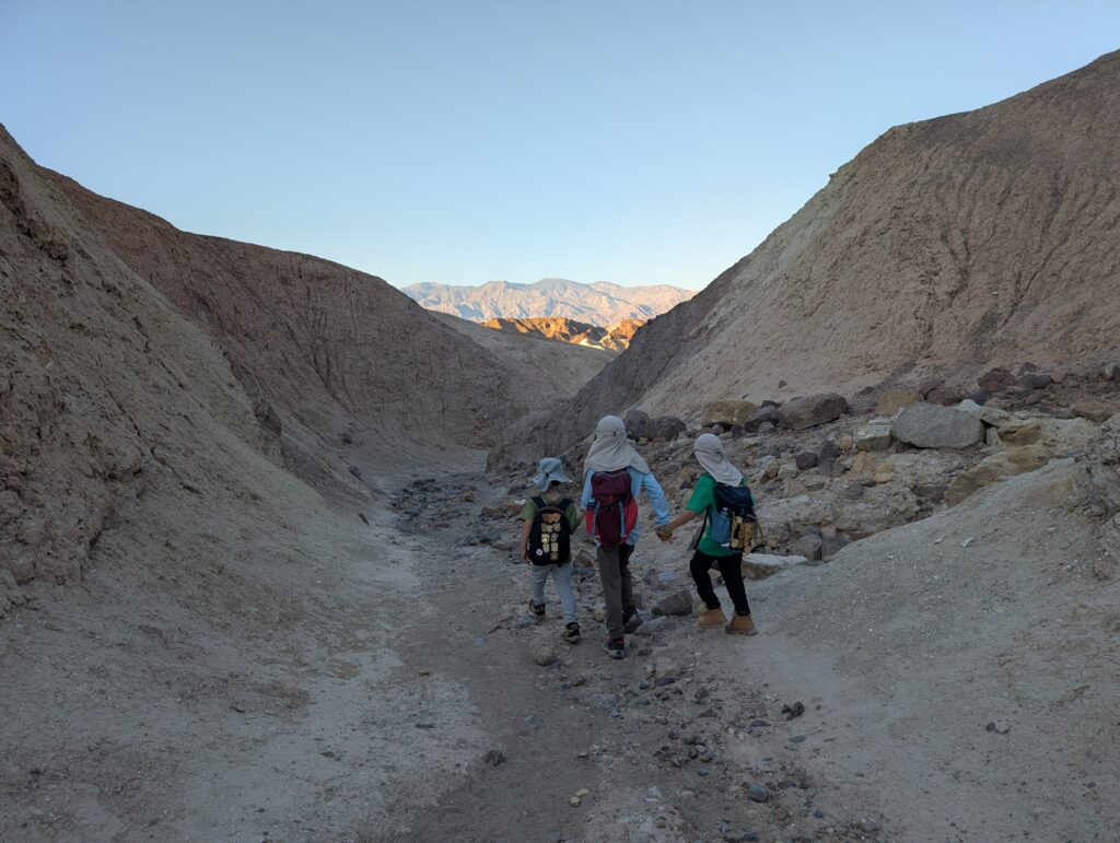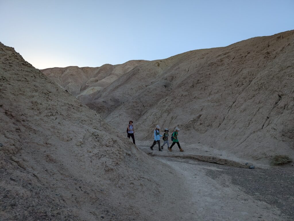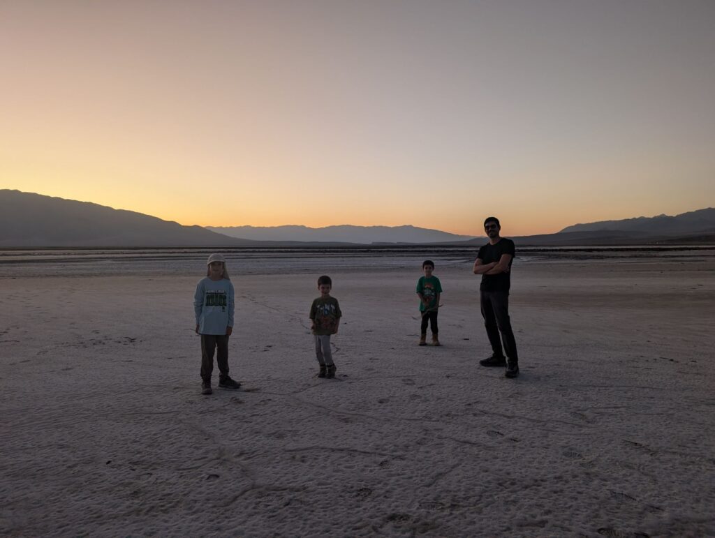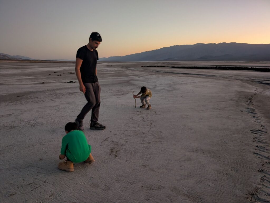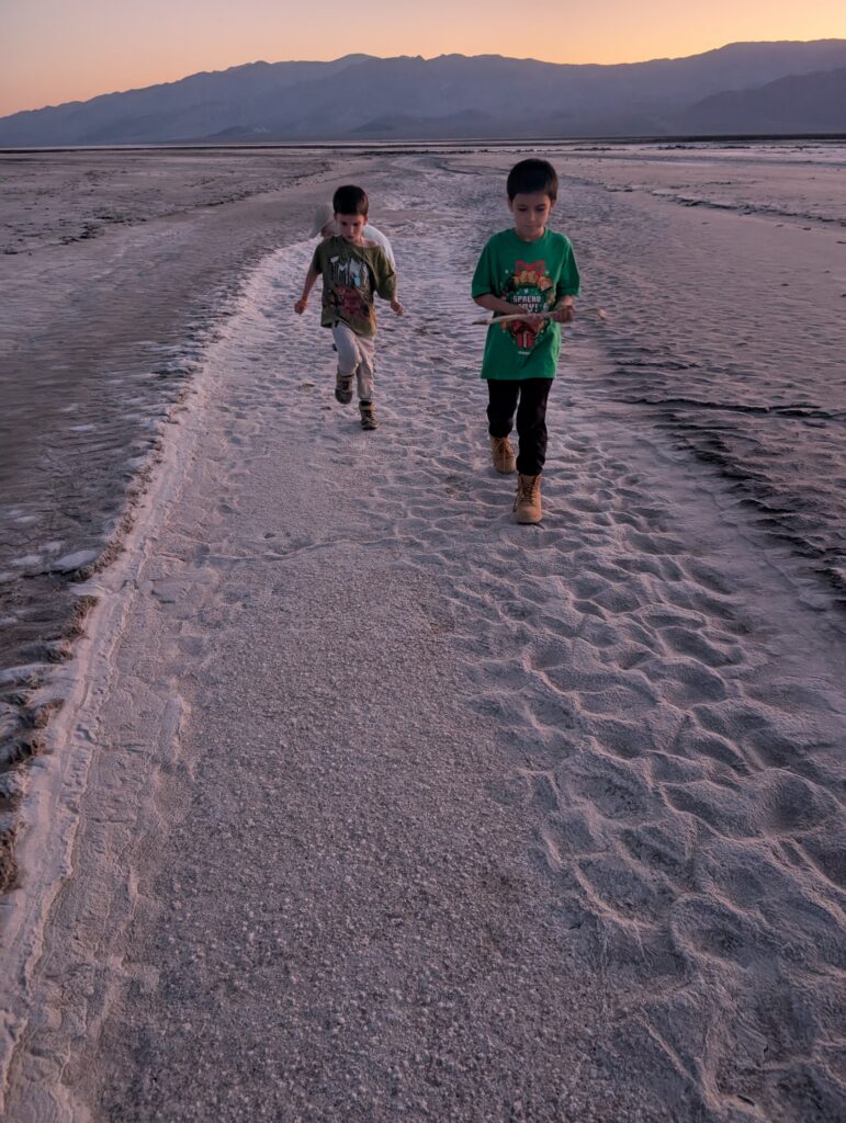 Nous aurions aimé emmener les enfants dans un grand désert de sel comme le Salar d’Uyuni. Malheureusement, avec les récentes inondations, la route menant à badwaters est fermée. Nous devons donc improviser. Au moment du coucher du soleil, nous tentons une petite promenade sur un itinéraire improvisé. Les enfants s’amusent énormément à courir sur une étendue plate couverte d’une fine épaisseur de cristaux. Mais ce n’est pas ce qu’on espérait.