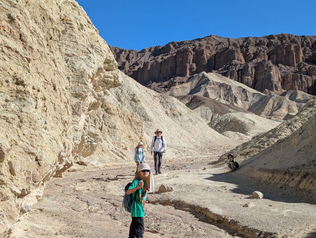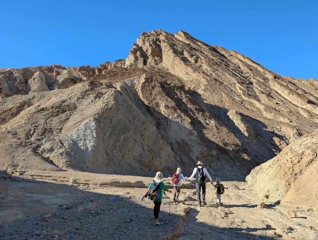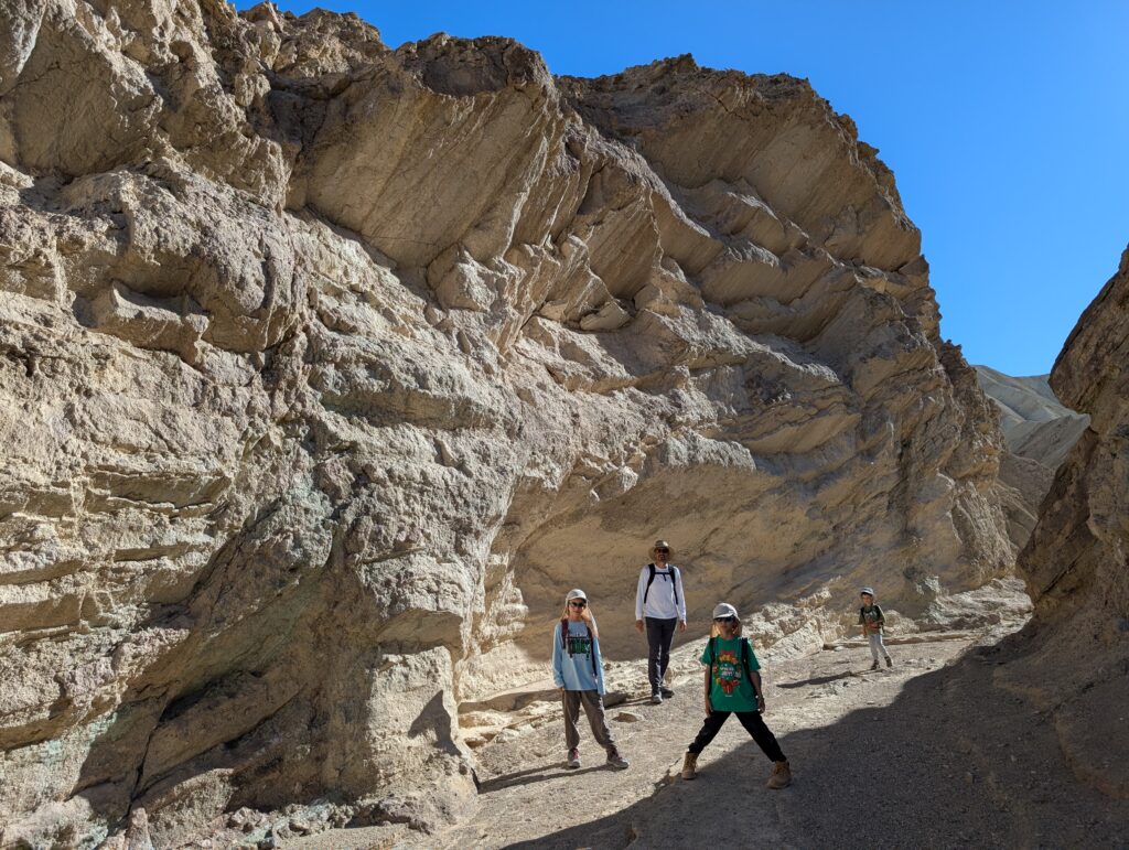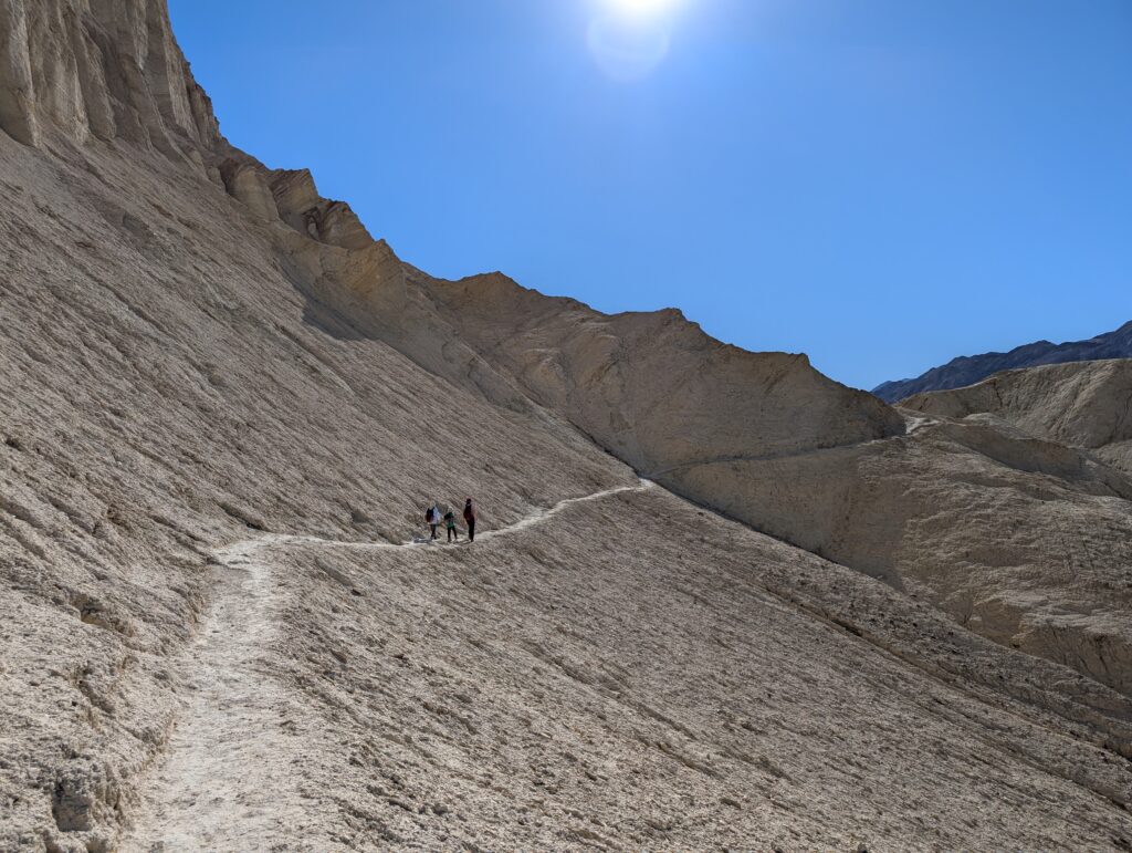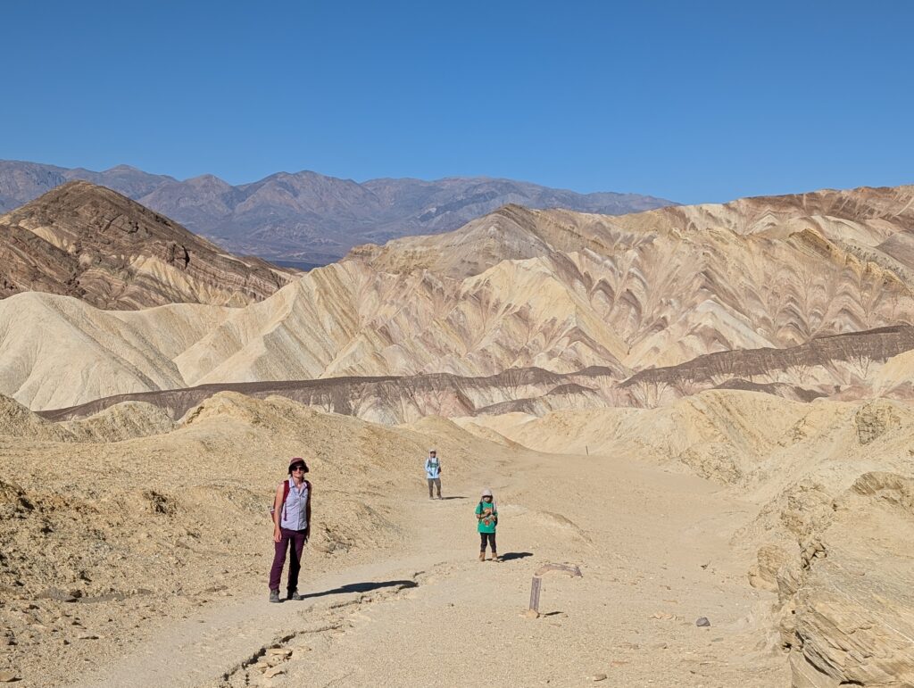 Entre les routes abîmées par l’inondation et celles interdites aux véhicules de plus de 25 pieds, nos possibilités sont assez limitées. Nous voulions visiter le « Golden canyon » mais la route y menant est inaccessible. Nous décidons donc de le rejoindre à pieds à partir du « Zabriskie point ».