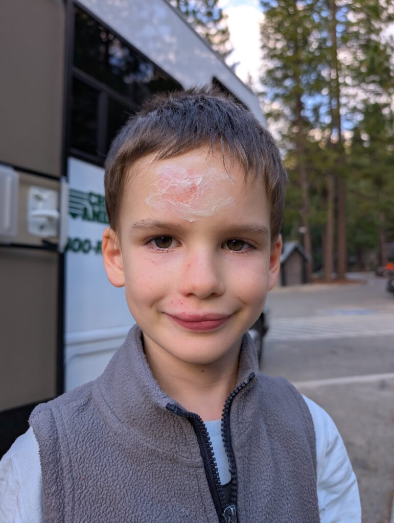 Je n’ose pas imaginer ce que ça aurait été s’il avait chuté depuis une des falaises ou sur le chemin de montagne où nous étions il y a quelques jours. Comme quoi les enfants peuvent se faire mal n’importe où, et on a bien raison de prendre toutes les précautions possible lorsqu’on est dans des endroits un peu dangereux.
