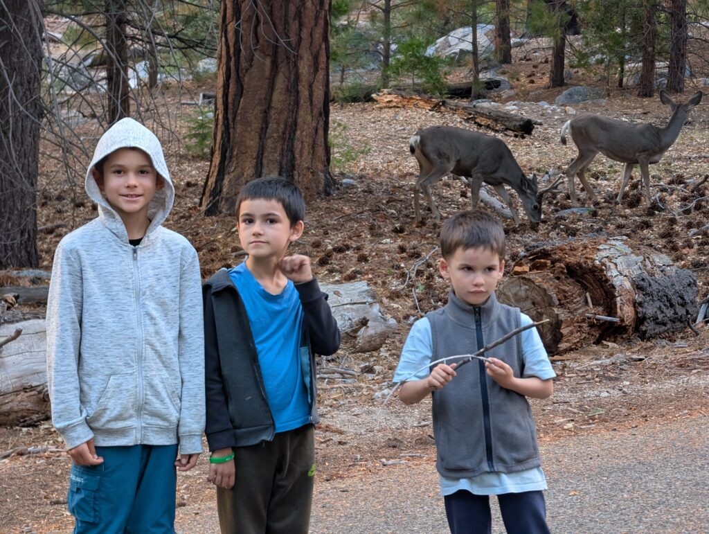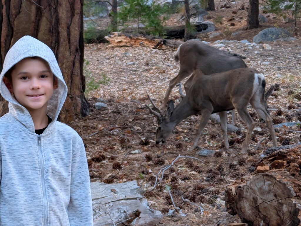 Nous repartons pour une dernière promenade et en chemin nous croisons une famille de biches qui reste avec nous pendant un bon moment, les enfants sont ravis.
