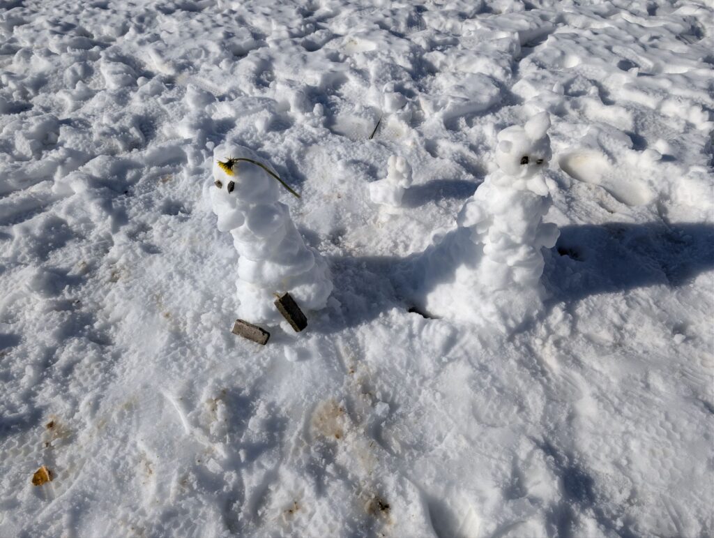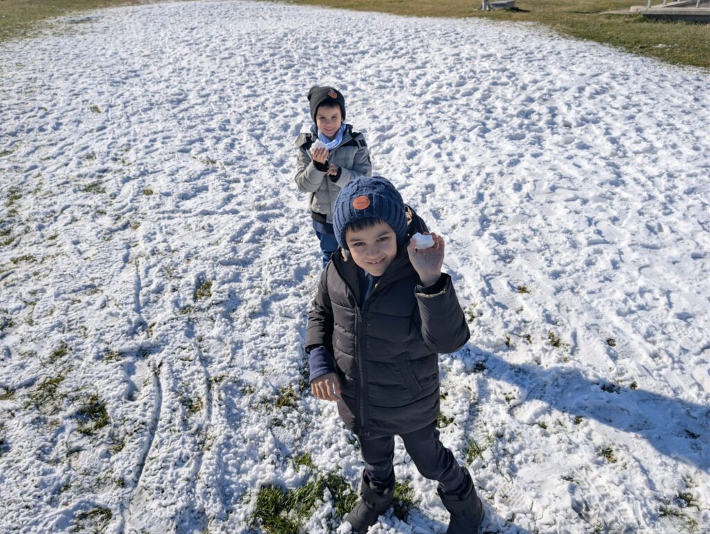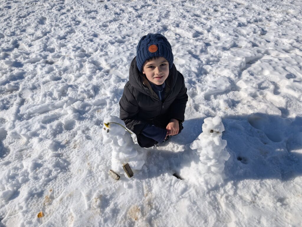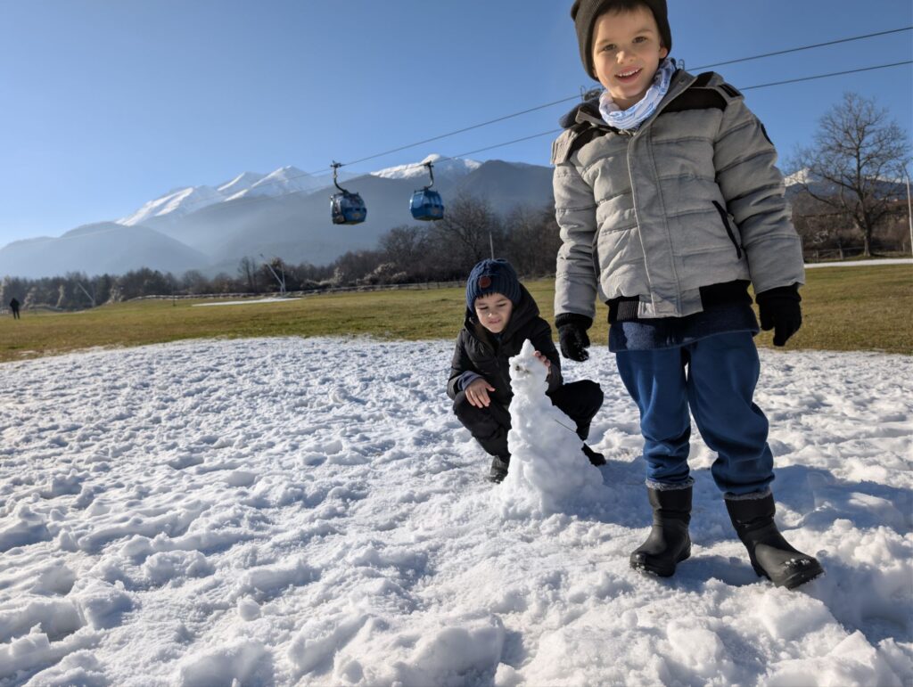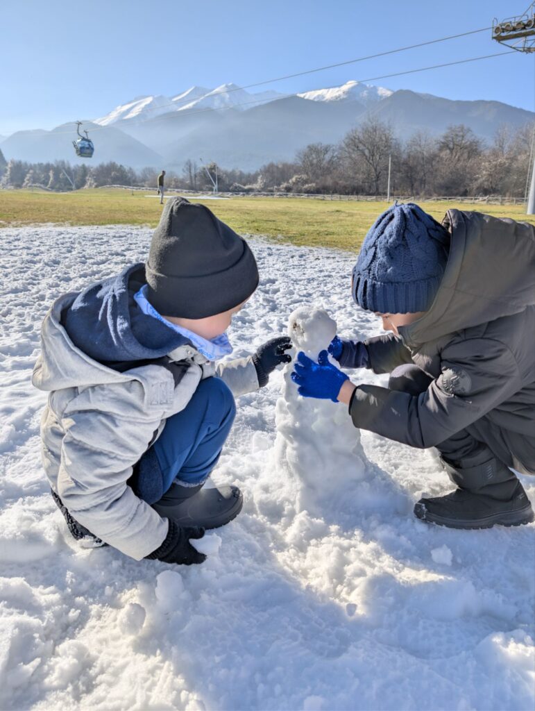 Pendant ce temps, en bas, Alexandre et Thomas s’amusent et construisent leur premier bonhomme de neige !