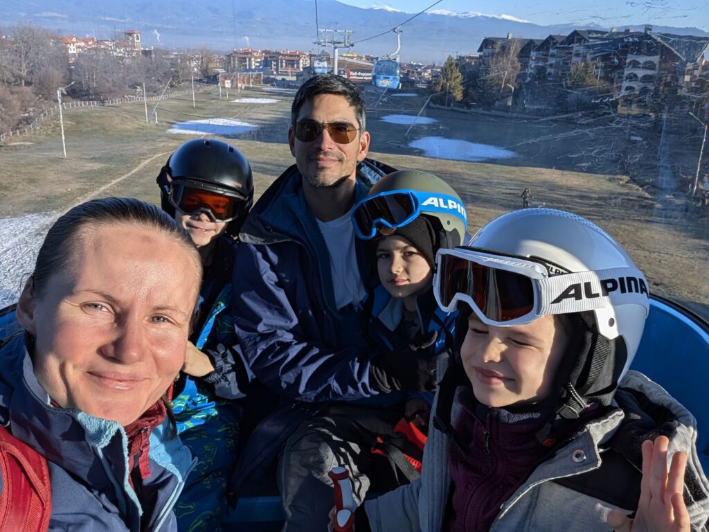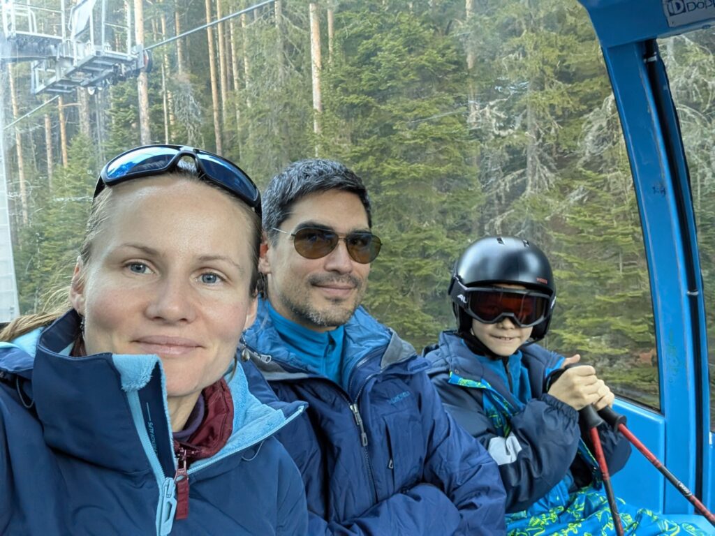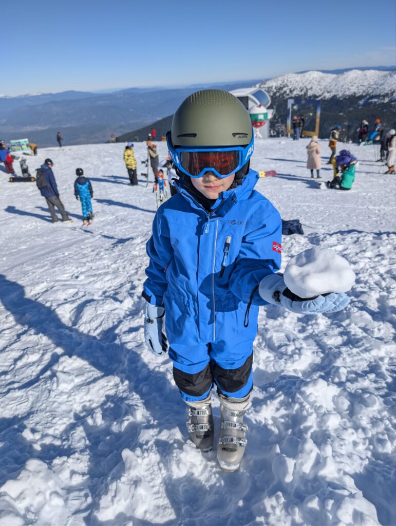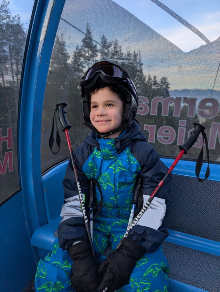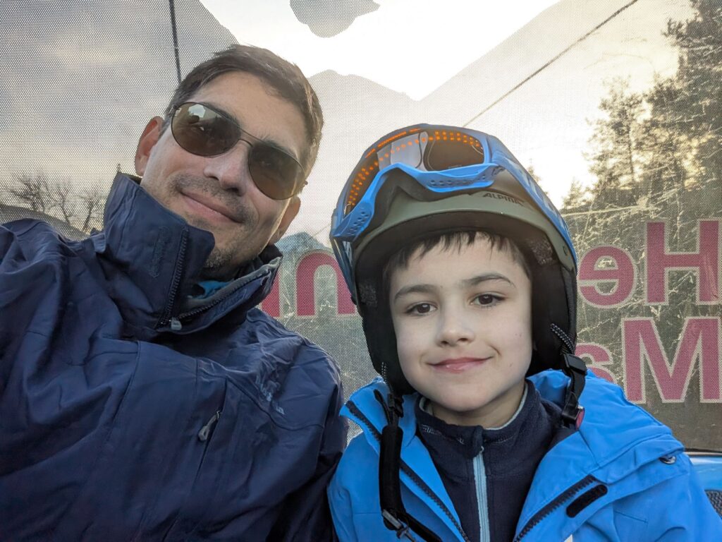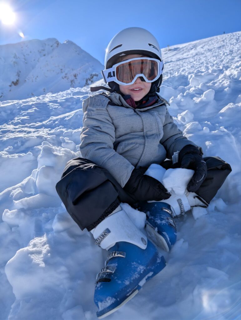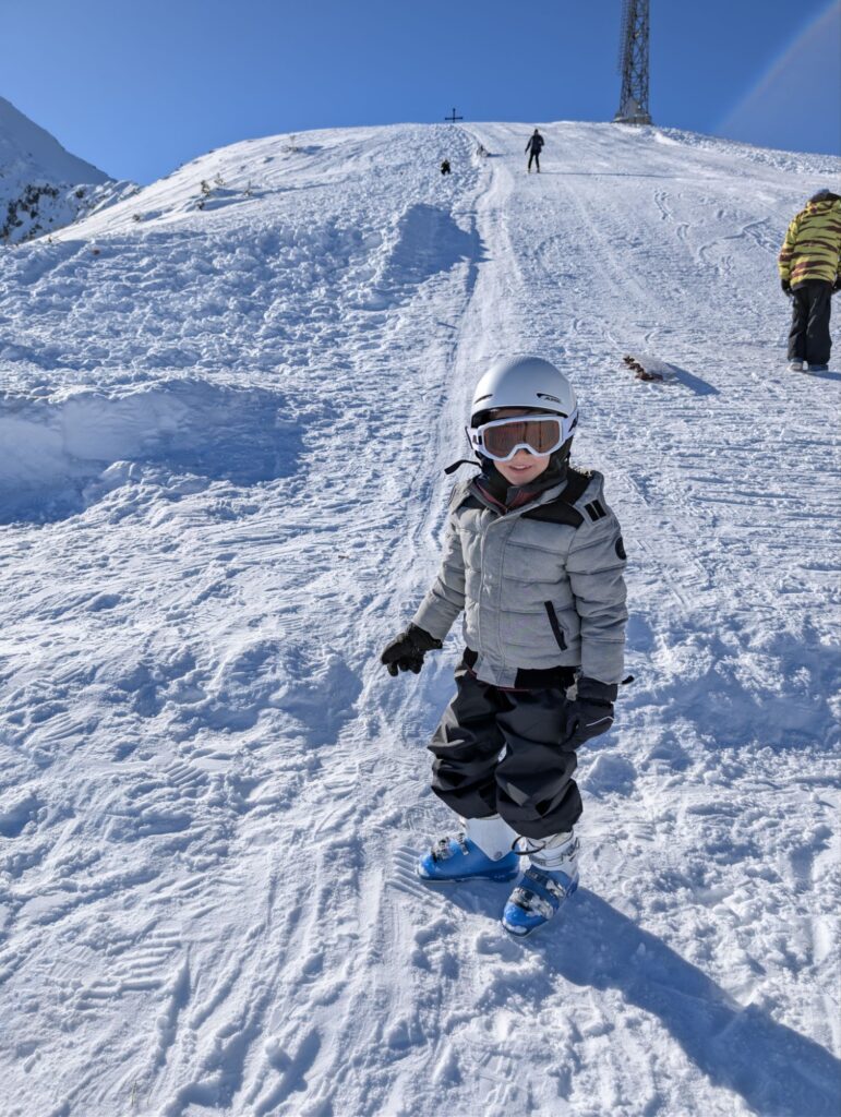 J’appelle Vineta qui n’est pas très motivée pour monter avec tous les enfants, mais m’envoie Adrien seul. Il prend le télécabine pour me rejoindre à la mi-journée à 1 600 mètres, et j’entreprends de lui enseigner les bases du ski sur une zone enneigée d’environ vingt mètres en légère pente. Adrien prend confiance et veut prendre le télésiège ; il est donc très motivé et parvient à maitriser rapidement la marche en canard et l’arrêt en chasse neige. Je l’emmène alors jusqu’au sommet, en prenant les deux télésièges. Là-haut, nous travaillons les virages en chasse-neige. Une vraie première demi-journée d’apprentissage !