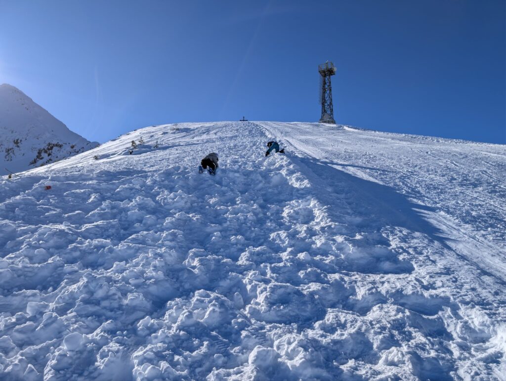 Le premier jour de ski, les conditions ne sont pas bonnes. D’après les informations dont nous disposons, il y aurait de la neige au sommet des pistes, mais pas suffisamment dans le reste du domaine skiable, et nous ne connaissons pas du tout l’organisation de la station. La ville se trouve à 1000m, le télécabine nous emmène à 1600m où on voit une petite tache de neige sur les webcams disponibles en ligne, mais c’est seulement à 2600m (deux télésièges plus haut) que les conditions sont réunies pour skier.