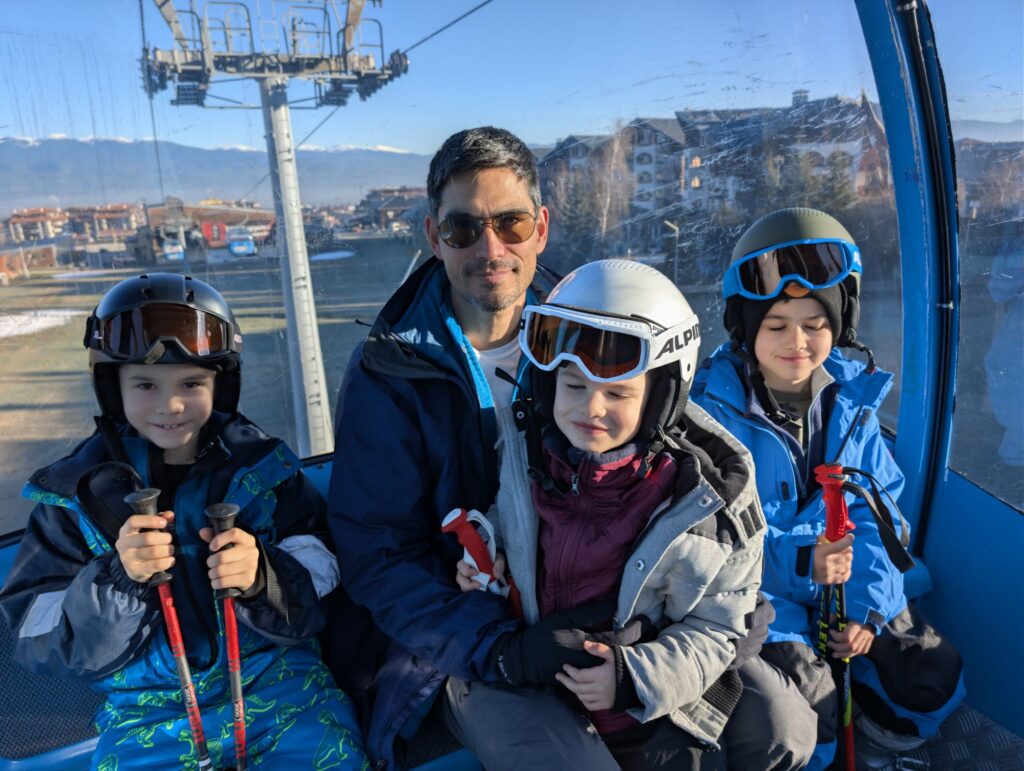Le lendemain, troisième jour pour Adrien et deuxième pour Alexandre, nous montons de nouveau tout en haut. Cette fois, je prends mes skis. Nous descendons une piste, puis nous la remontons avec le télésiège. Il n’y a pas de piste verte : c’est une bleue. Elle est longue, avec une portion bien pentue. Nous réussissons à la faire trois fois dans la journée. À plusieurs reprises, je descends la piste en portant Alexandre entre mes skis dans les passages les plus raides mais Adrien descend sans problème.