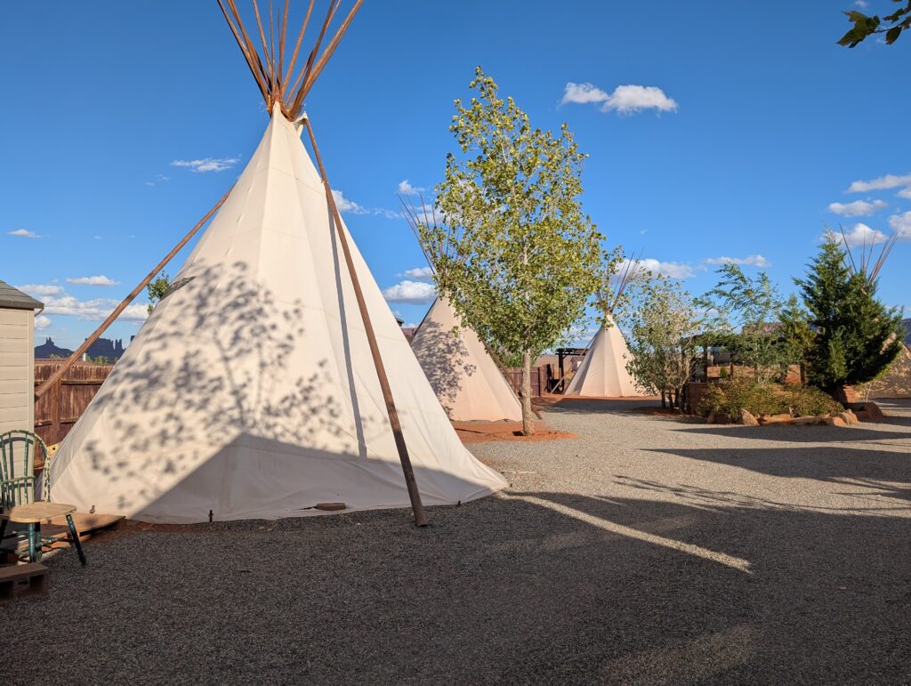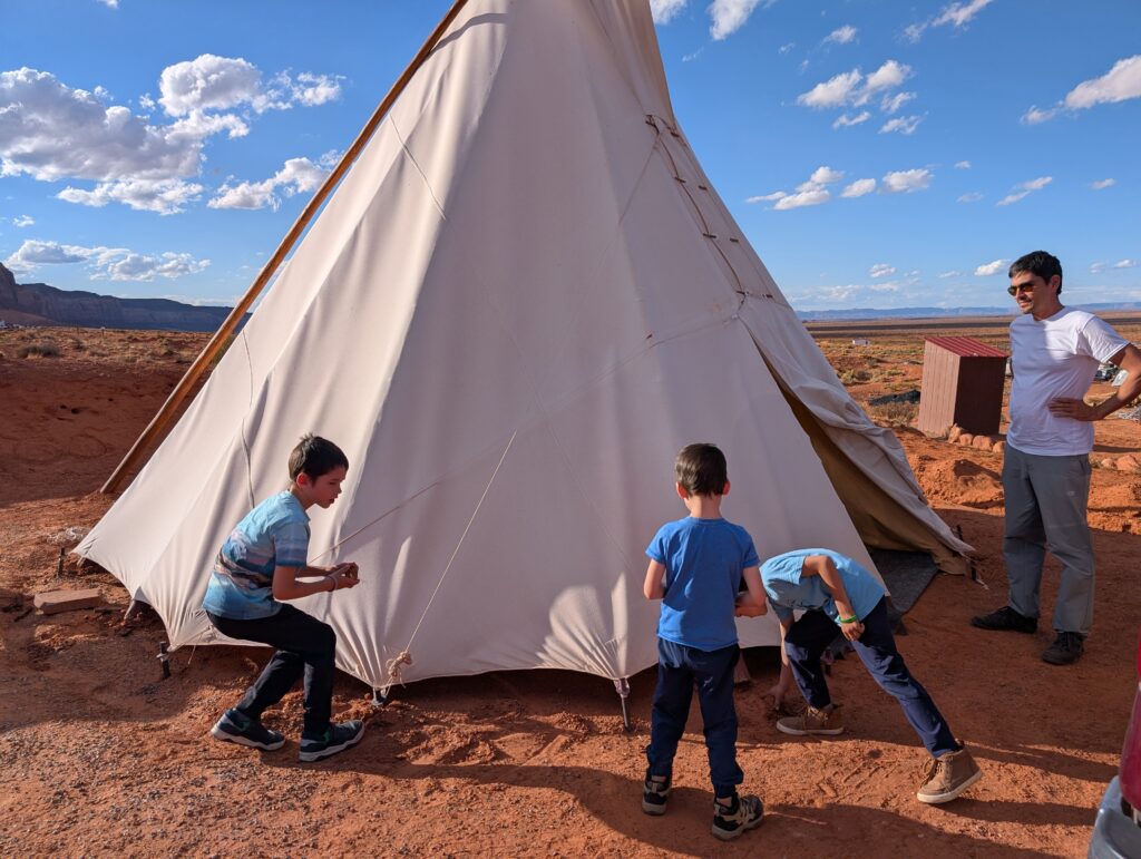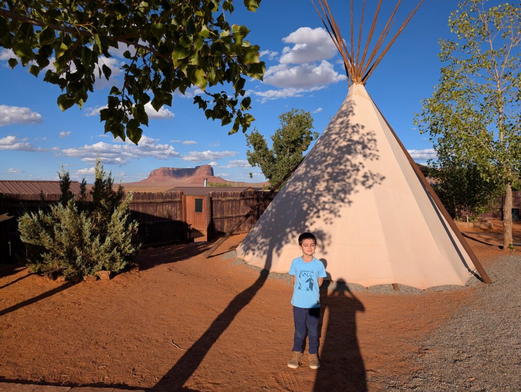 En discutant avec le personnel de l’agence, nous rencontrons le neveux de Aaron chez qui j’avais prévu de passer la nuit. Il a un village de tipis ce qui va beaucoup amuser les enfants qui adorent Yakari et son univers. Nous nous installons donc pour la nuit chez des indiens dans un village de tipis.