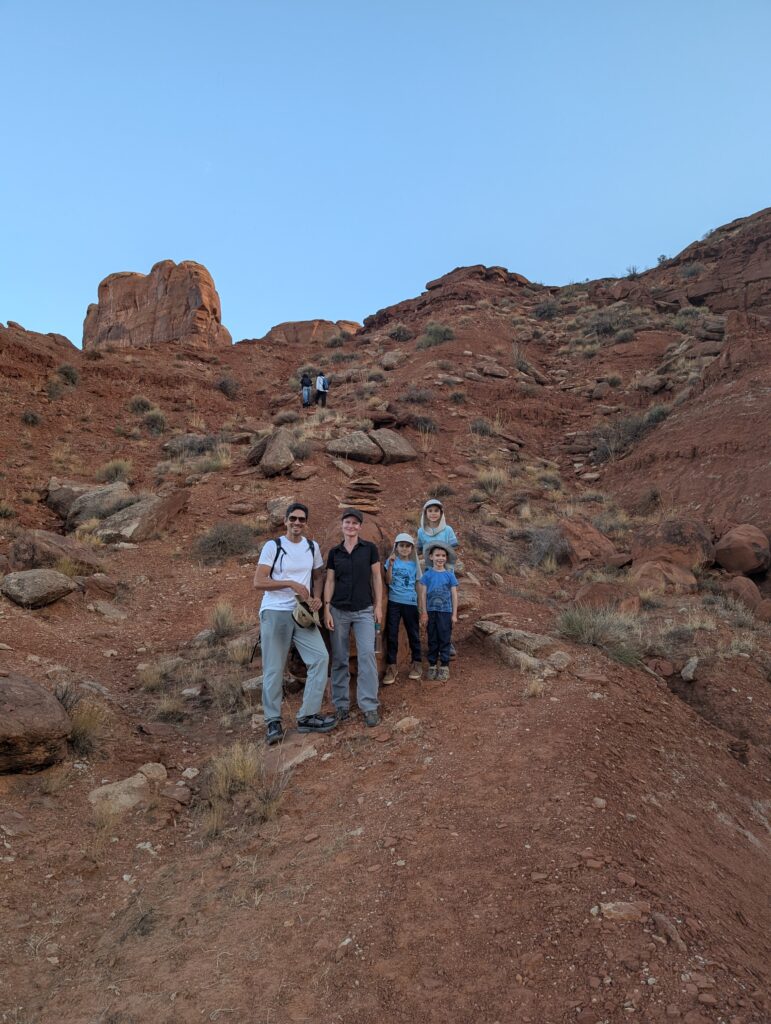 Le soir commence à tomber et il faut redescendre. Le chemin n’est pas facile à retrouver. Heureusement le enfants ont construits de petits cairns sur le chemin et on dessiné des flèches avec des cailloux sur de la roche.