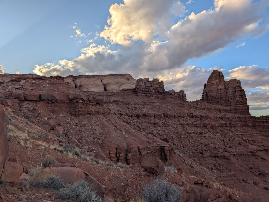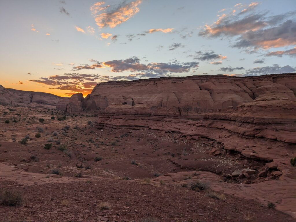 Aaron nous propose d’aller nous promener dans les roches si particulières de Monument Valley et qui se trouvent juste derrière lui. Nous faisons une toute petite promenade car il se fait tard mais au retour, nous croisons Aaron qui accompagne deux japonaises pour leur montrer le début d’un sentier qui grimpe jusqu’au sommet. Nous ne résistons pas à l’envie des les accompagner.