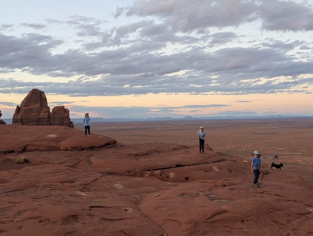 Il est impossible de circuler avec notre véhicule dans sur les pistes défoncés de Monument Valley, nous sommes donc contraints de réserver un circuit en 4×4 avec un guide, ce qui ne nous plait pas trop. Nous signons avec « Dineh Bekeyah Tours », la première agence rencontrée, qui nous accueille très gentiment et dont les tarifs sont honnêtes mais surtout, elle ne fait pas payer les enfants ce qui fait une énorme différence pour nous.