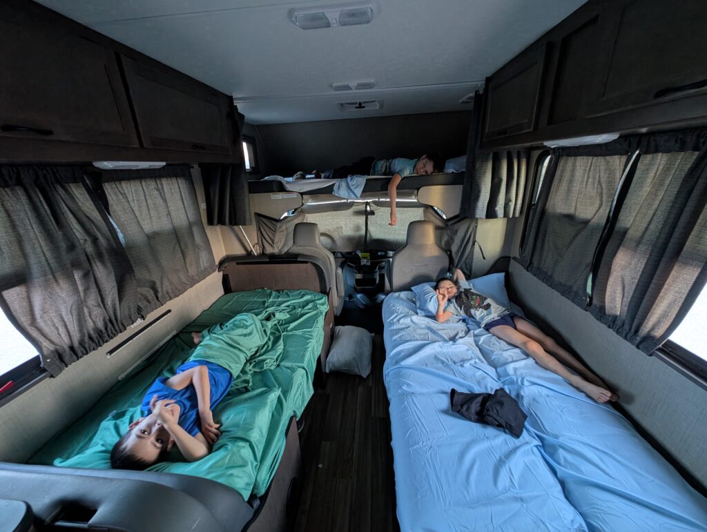 Je ne regrette pas du tout d’avoir pris le plus grand, on est vraiment bien à l’intérieur : les enfants ont chacun leur lit, les parents ont une chambre à l’arrière. Nous avons une douche, des wc, frigo, congélateur, cuisinière à gaz, micro ondes, climatisation et chauffage.