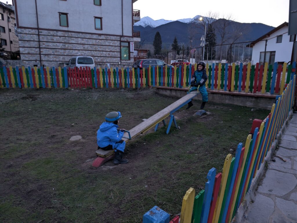 Après le ski, nous traversons parfois la ville à pieds ou bien nous allons faire des courses dans un petit supermarché proche d’une aire de jeux. Les enfants se profitent inlassablement pour jouer dans des cris de joie.