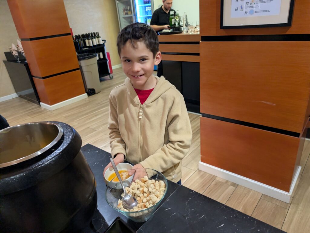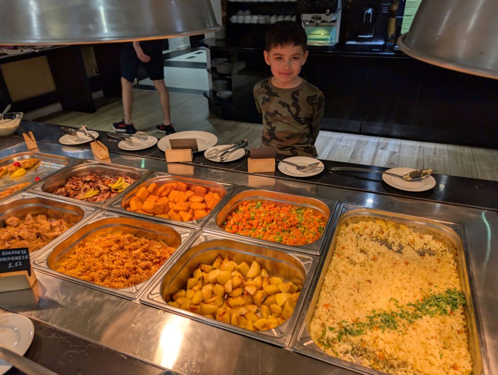 Dès qu’il y a une vingtaine de personnes, l’hôtel organise un buffet pour le diner. Un vrai bonheur pour les enfants qui peuvent tout gouter et choisir leurs plats. En plus ils n’ont pas à attendre le service ce qui est un vrai plus car après le premiers jours de ski, ils commencent à s’endormir à table !